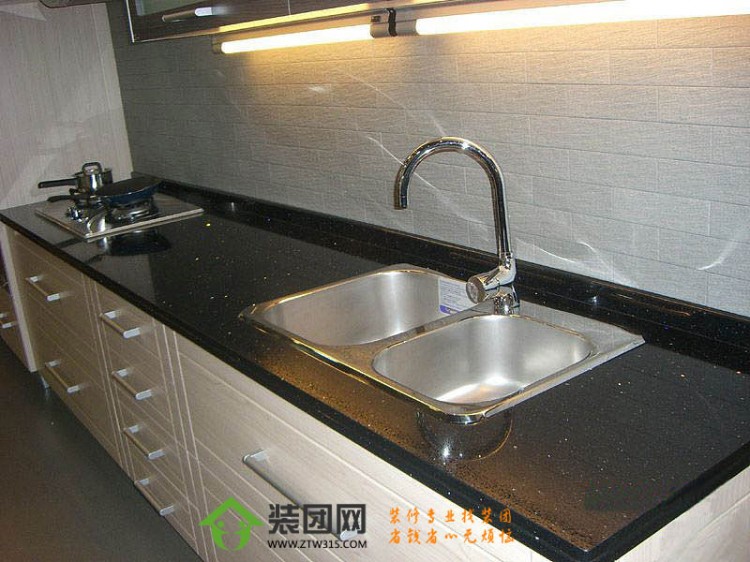 3、石英台面:石英台面是一种由90%以上的石英晶体加上树脂及其他微量元素人工合成的一种新型石材的厨房面。